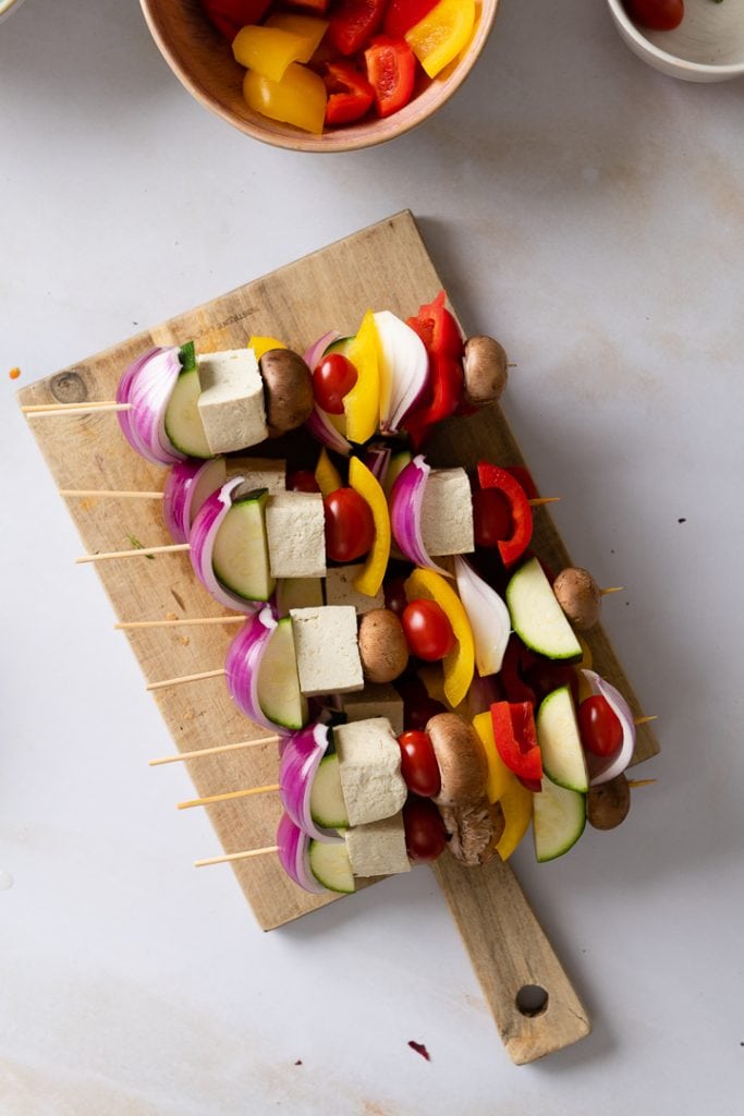 Spieße nun abwechselnd Gemüse und Grillkäse auf die gewässerten Grillspieße auf.