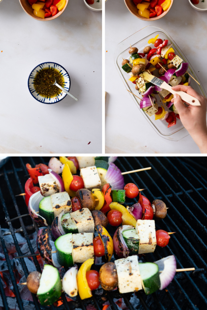 Vermenge für die Marinade alle Zutaten gründlich und pinsel die Grillspieße damit ein. Lasse sie für mindestens 30 Minuten marinieren und gare die Grillspieße dann auf dem heißen Grill bis sie rundherum goldbraun gebacken sind.