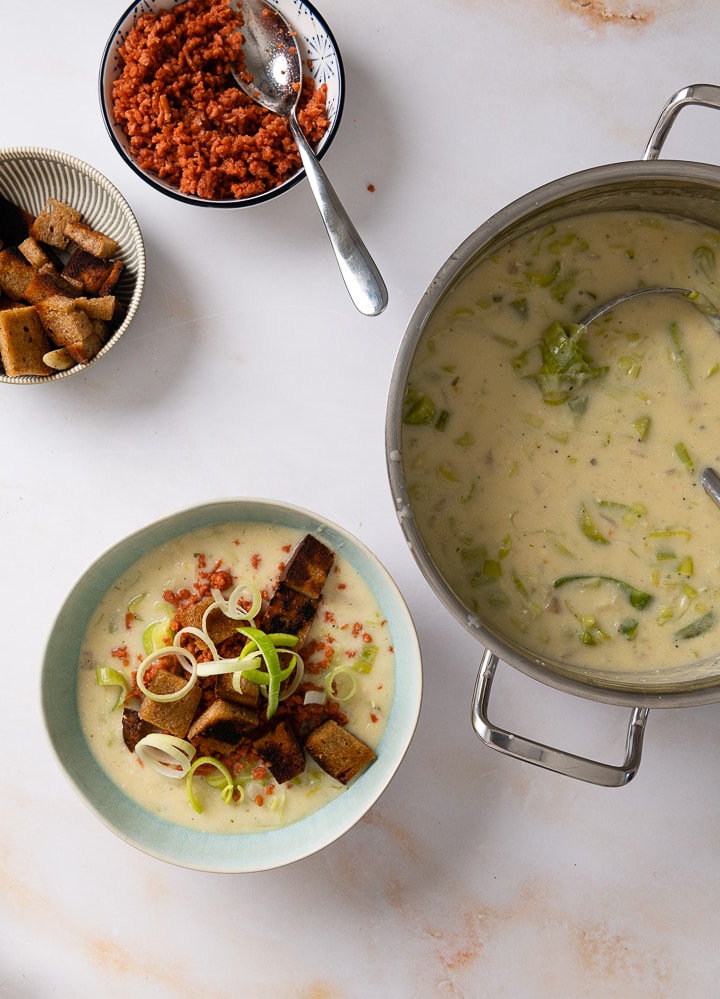 Einfaches Rezept für cremige Käse Lauch Suppe mit Schmelzkäse und Bergkäse. Fertig im Nu schmeckt die herzhafte Suppe wie von Oma. Mit veggie Hack und Croûtons serviert gibt es kaum eine bessere Suppe für kühle Herbst- und Wintertage.