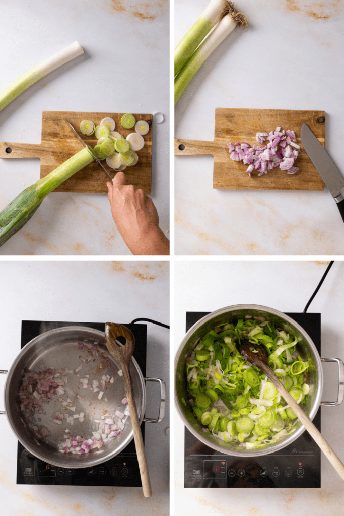 Zwiebel fein hacken und Lauch in feine Ringe schneiden. Lauch vorher gründlich waschen. In einem großen Topf das Öl erwärmen und Zwiebel und Lauchringe darin anbraten. Etwa 2 EL der Lauchringe zurückbehalten, sie werden später zum Servieren benötigt.