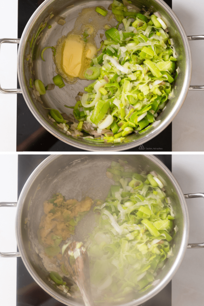 Wenn Zwiebeln und Lauch glasig sind diese kurz aus dem Topf nehmen in einer Schüssel bereit halten. Im Topf Butter schmelzen. Dann das Mehl dazu geben und so lange kräftig rühren bis der Duft von rohem Mehl verschwunden ist und die helle Mehlschwitze eine goldgelbe Farbe hat. Schluckweise mit Gemüsebrühe ablöschen. Dabei kräftig rühren, sodass sich keine Klümpchen bilden können.