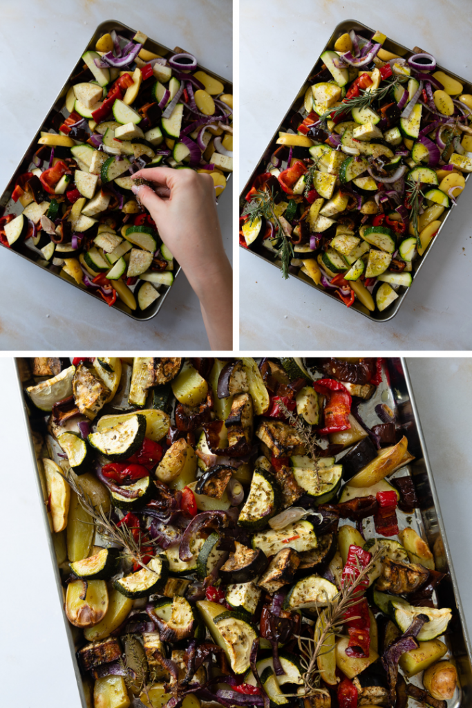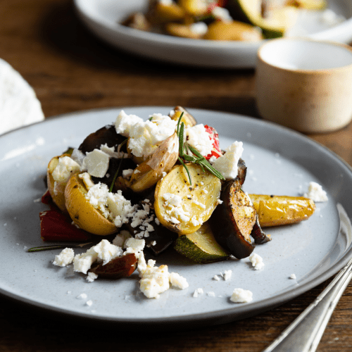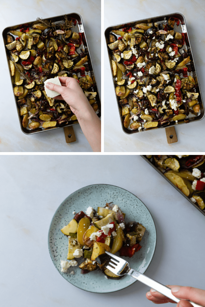 Feta über das Ofengemüse bröseln und servieren.