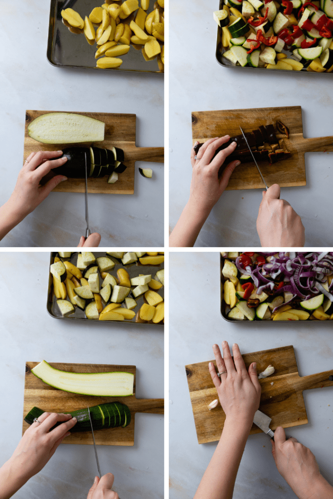 Aubergine, Zucchini und Spitzpaprika waschen und in mundgerechte Stücke schneiden. Ebenfalls auf das Backblech legen. Zwiebel in grobe halbringe Schneiden, mit aufs Blech legen. Knoblauchzehen mit dem Messerrücken andrücken und zum Gemüse geben.