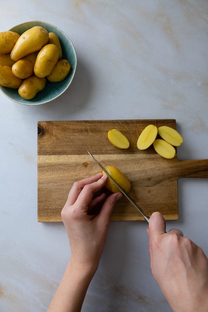 Backofen auf 170 °C Ober- und Unterhitze vorheizen. Ein Backblech vorbereiten, ggf. mit Backpapier auslegen. Kartoffeln waschen und nach bedarf schälen. Wenn es junge Kartoffeln sind bzw. die Schale schön ist, kannst du das Schälen auch überspringen. Kartoffeln dann in Hälften oder Viertel schneiden. Kartoffeln auf das Backblech legen.