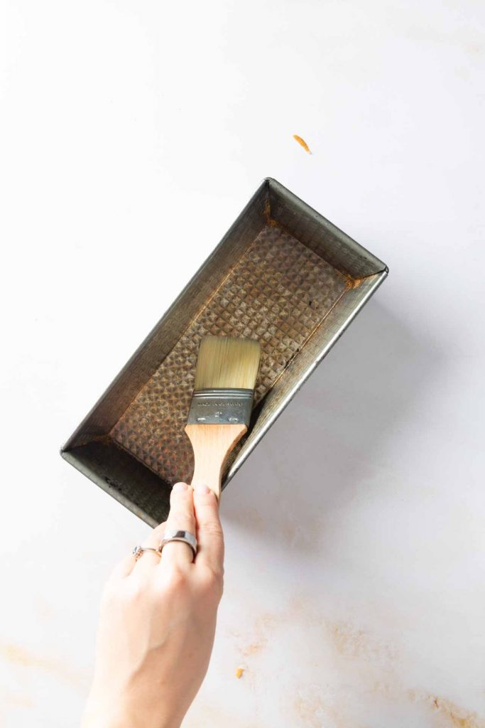 Backofen auf 200 °C Ober- und Unterhitze vorheizen. Eine Kastenform mit Öl auspinseln und mit Backpapier auslegen.