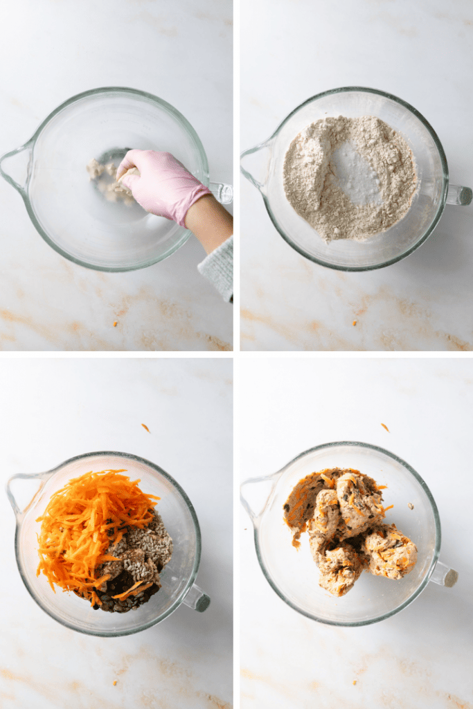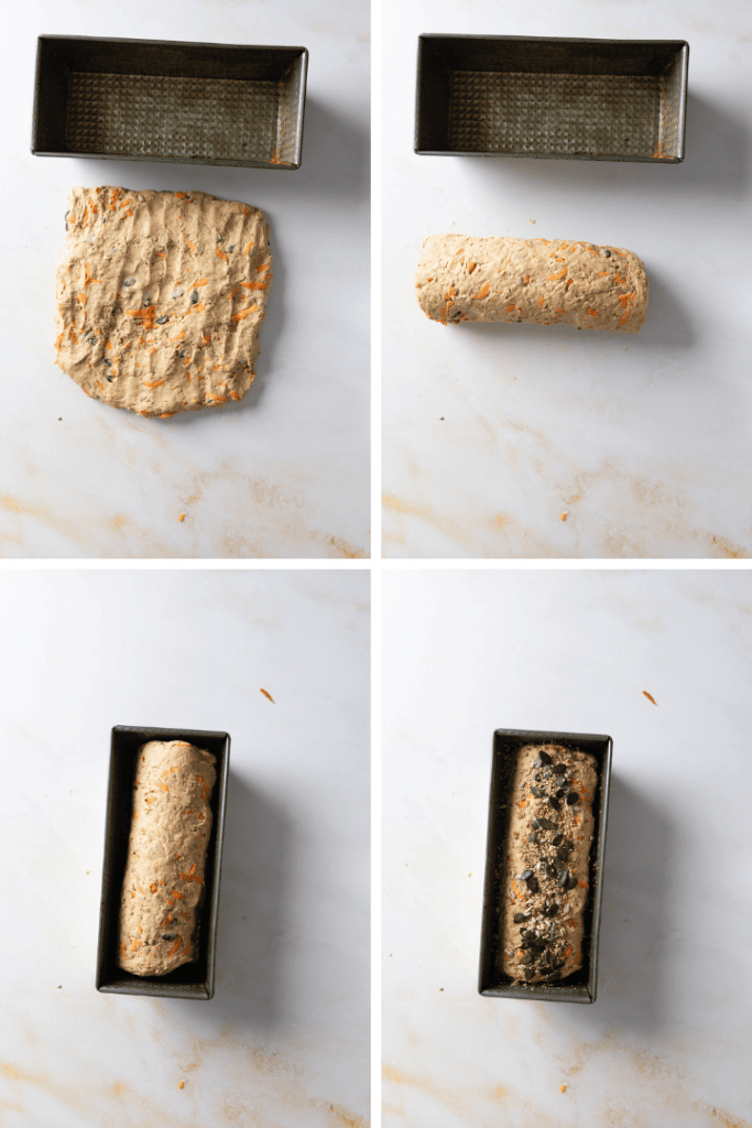 Die Karotte kann auch weggelassen werden. Dann solltest Du 50 ml mehr Wasser verwenden.Sollte dein Teig flüssiger sein als meiner, fülle ihn einfach direkt in die Form. Ich habe beim Testen Emmermehl verwendet, das etwas mehr Wasser ausnimmt als konventionelles Weizenmehl.