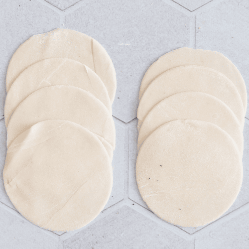 Rolle die Teigportionen zunächst individuell so dünn wie du kannst aus. Lege dann zwei Teige übereinander mit reichlich Reismehl dazwischen. Schlage die Teige dann um das Nudelholz. Durch diese Technik wird der Teig besonders zart. Schneide den Wan Tan Teig dann in Quadrate oder Stich Kreise daraus aus.