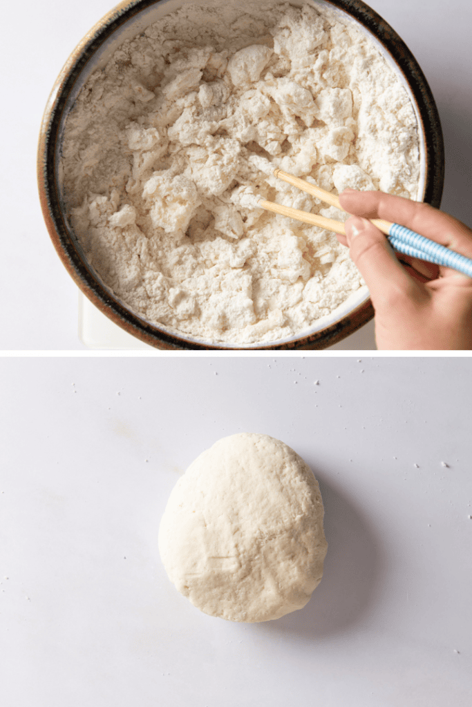 Gib Weizenmehl und Salz in eine Schüssel und vermenge es kurz. Füge dann das heiße Wasser hinzu und rühre es zunächst kräftig unter. Sobald der Teig klumpig ist, gibst du ihn auf die Arbeitsfläche und knetest ihn für einige Minuten geschmeidig.