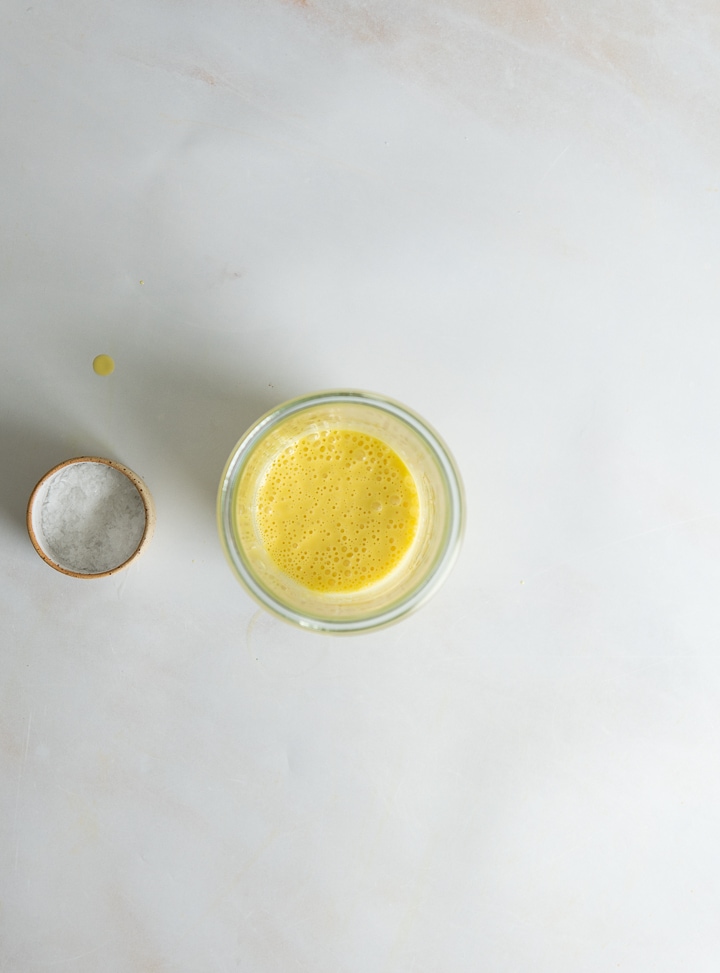 Öl in ein hohes Mixgefäß geben. Milch und Knoblauch dazugeben. Nun einen Stabmixer ausgeschaltet in das Gefäß stellen, sodass er den Boden berührt. Stabmixer dann einschalten und langsam nach oben ziehen. Vorgang wiederholen, bis eine feste Creme entstanden ist. Mit Salz abschmecken.
