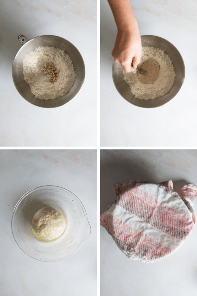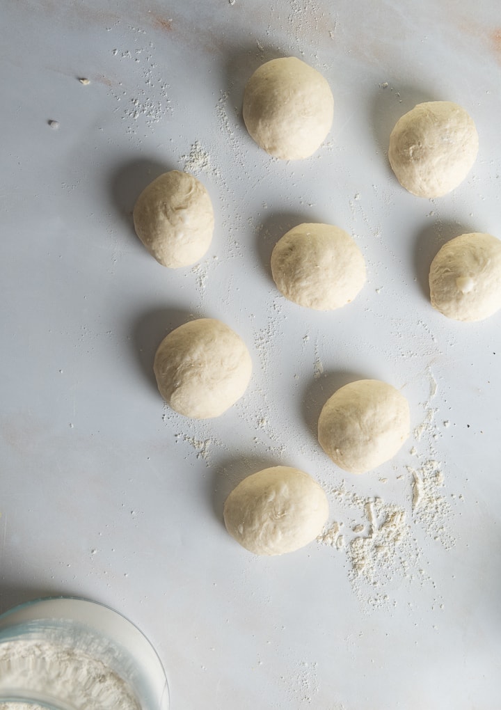 Teig zugedeckt an einem warmen Ort etwa 1 Stunde aufgehen lassen, bis sich sein Volumen verdoppelt hat. Den Teig dann in 10 etwa gleich große Portionen teilen. Jeweils zu einer kleinen Kugel formen.