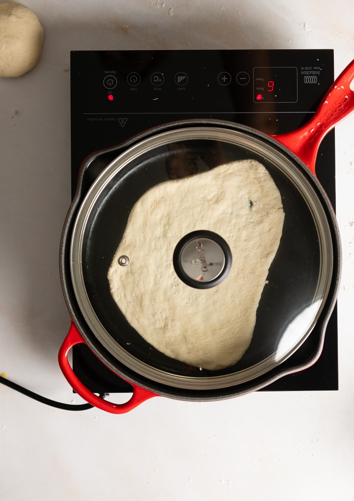 Eine Pfanne aus Gusseisen oder Edelstahl auf mittlerer bis hoher Hitze erwärmen. Den ersten Teigfladen mit etwas Mehl ca. 3-4 mm dick ausrollen. Direkt in die heiße Pfanne geben. Einen Deckel auf die Pfanne setzen, bis sich große Luftblasen auf dem Teig gebildet haben und die Unterseite goldbraun gebacken ist. Naan wenden und auch auf der anderen Seite goldbraun backen.