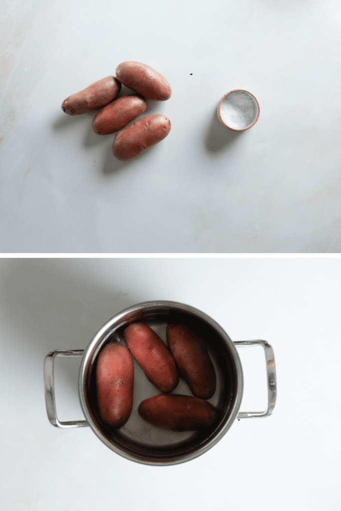 Kartoffeln in einen ausreichend großen Topf geben und mit kaltem Wasser bedecken. Salz dazugeben und Kartoffeln bei geschlossenem Deckel zum Kochen bringen. Je nach Größe der Kartoffeln 20-30 Minuten garen. Teste den Garpunkt am besten mit einem scharfen Messer und piekse die Kartoffeln an. Wenn du keinen Widerstand spürst, sind sie gar.