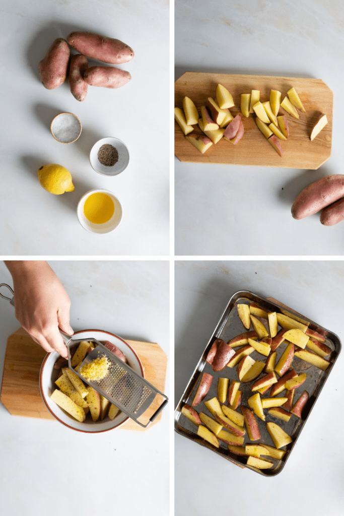 Backofen auf 170 °C Ober- und Unterhitze vorheizen. Kartoffeln in Spalten schneiden, mit Öl beträufeln, Salz, Pfeffer und Zitronenabrieb dazugeben und vermengen. Die Kartoffelspalten dann auf ein Backblech mit Backpapier geben und im vorgeheizten Backofen etwa 20-30 Minuten goldbraun backen.