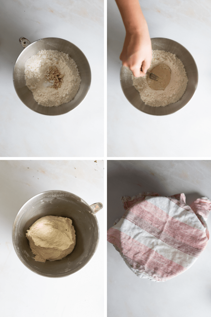 Mehl in eine große Rührschüssel geben. In der Mitte eine Mulde formen, Zucker hinein geben und die Hefe dazu bröseln. Mit dem lauwarmen Wasser einen Vorteig in der Mulde anrühren. Zugedeckt an einem warmen Ort etwa 10 Minuten aufgehen lassen. Dann Milch, Joghurt, Natron und Salz hinzufügen und den Teig mit der Küchenmaschine für etwa 10 Minuten kneten, bis ein glatter Teig entstanden ist.