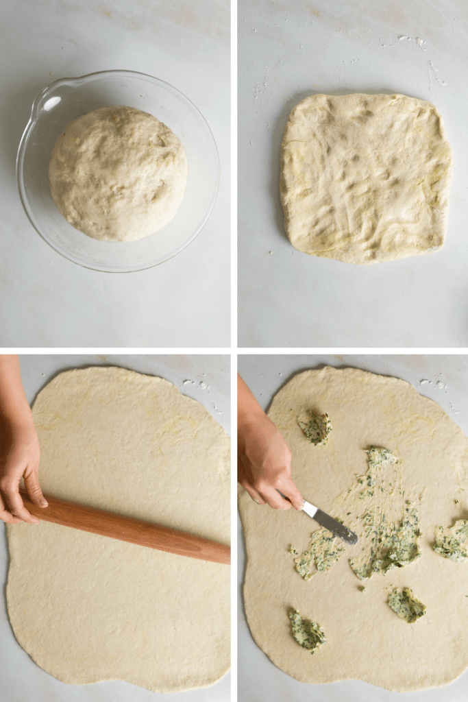 Teig zugedeckt an einem warmen Ort für ca. 1 Stunde aufgehen lassen, bis sich das Volumen verdoppelt hat. Den Teig dann auf der Arbeitsfläche mit etwas Mehl zu einem möglichst gleichmäßigen Rechteck ausrollen. Der Teig sollte etwa 3 mm dick sein. Den ausgerollten Teig dann mit der Knoblauchbutter bestreichen.