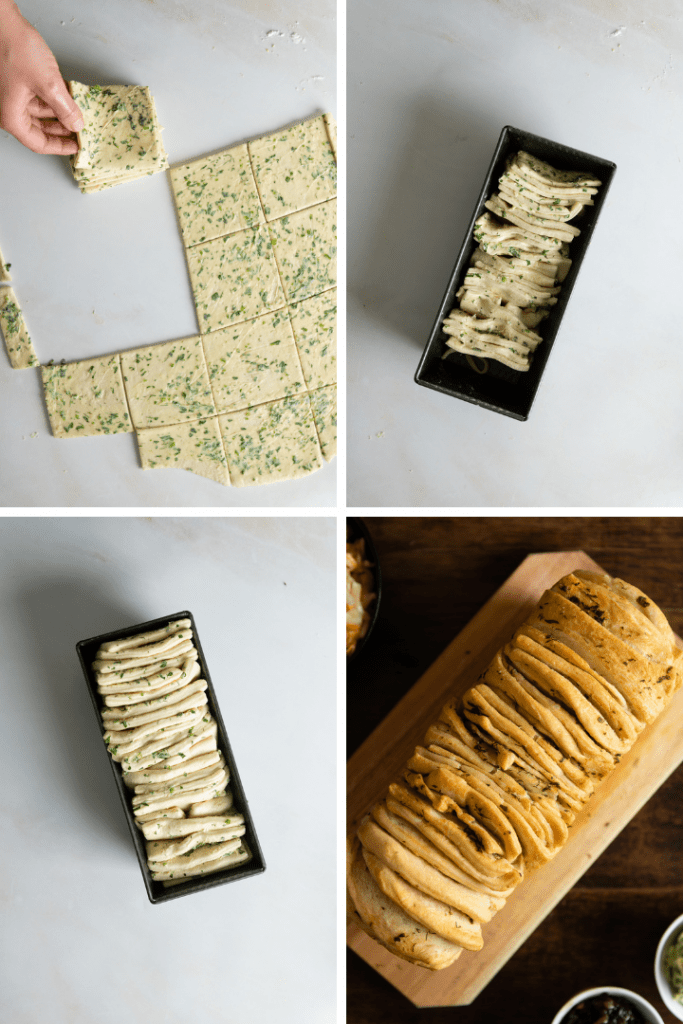 Teig in etwas gleich große Quadrate schneiden. Besonders gut geht das mit einem Pizzaroller. Dann die Quadrate stapeln und in eine vorbereitete Kastenform stellen. Kräuterfaltbrot in der Form nochmal für etwa 30 Minuten aufgehen lassen. Derweil den Backofen auf 170 °C Ober- und Unterhitze vorheizen. Das Kräuterfaltbrot etwa 45 Minuten backen, bis es goldbraun ist.