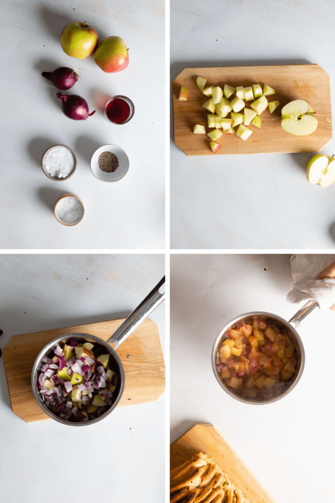 Äpfel waschen, vierteln und das Kernhaus entfernen. Apfel in grobe Würfel schneiden. Die Zwiebel fein würfeln. Öl in einem Topf erwärmen, die Zwiebel darin anschwitzen, dann die Apfelwürfel dazugeben. Ahornsirup und Apfelessig hinzufügen. Bei geschlossenem Deckel etwa 15 Minuten köcheln lassen, bis die Äpfel zerfallen sind. Mit Salz und Pfeffer abschmecken.