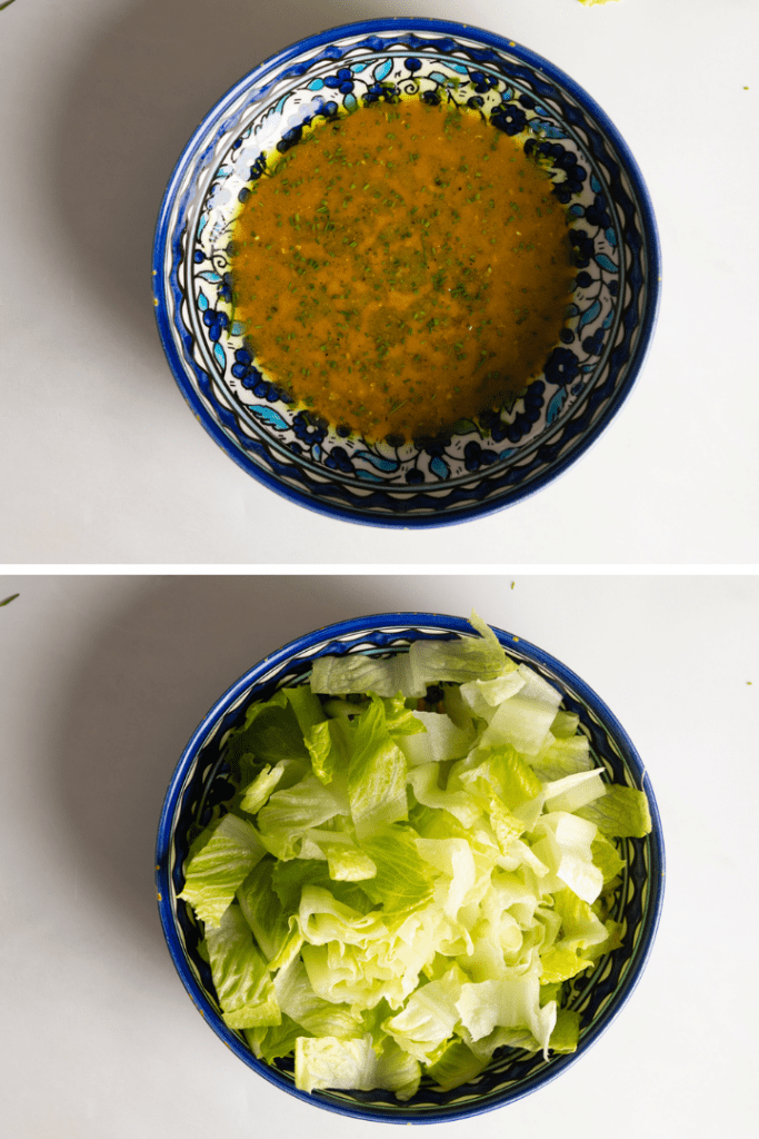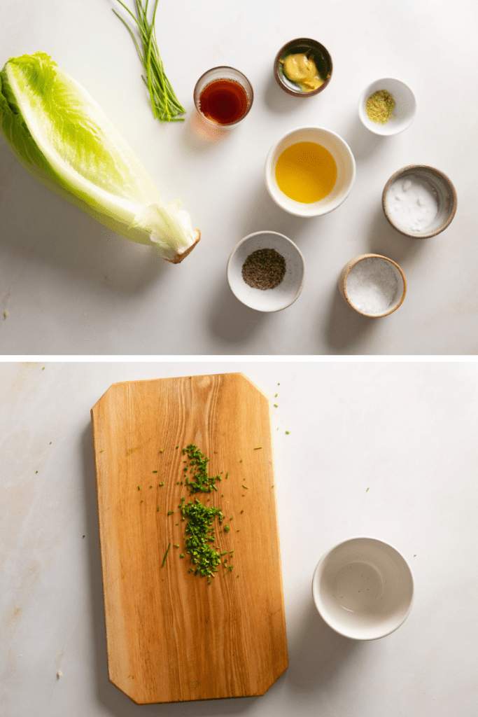 Salat putzen und waschen und in mundgerechte Stücke schneiden oder reißen. Schnittlauch fein hacken.