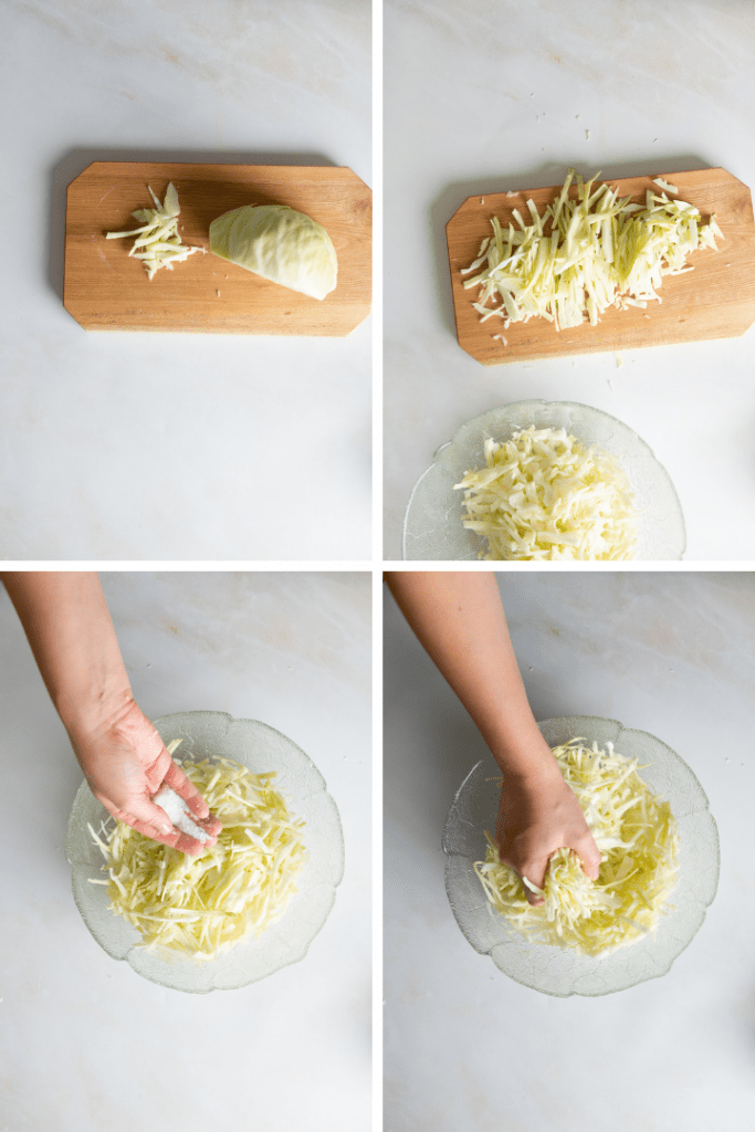 Weißkohl vom Strunk befreien und mit dem Messer oder einem Küchenhobel in feine Streifen schneiden. Mit 1 TL Salz bestreuen und vermengen. Nun mit sauberen Händen den Kohl etwa 5-10 Minuten kräftig kneten, sodass er zart wird und überschüssiges Wasser austreten kann. Das Wasser dann abgießen.