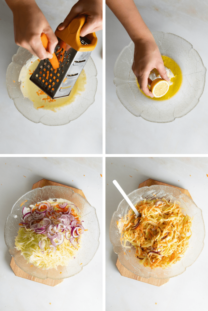 Karotte raspeln und zum Kohl geben, Zwiebeln in feine Halbringe schneiden. Für das Dressing Joghurt, Zitronensaft, Pflanzenöl sowie Senf und Zucker gut vermengen. Dressing zum Gemüse in die Schüssel geben und kräftig untermengen. Mit Salz und Pfeffer abschmecken.