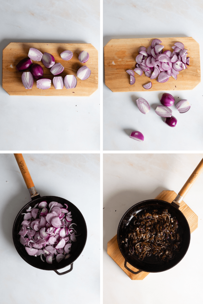 Zwiebel in Halbringe schneiden. In einer Pfanne das Öl erwärmen. Zwiebeln nun bei mittlerer Hitze unter gelegentlichem Rühren etwa 20-25 Minuten anbraten, bis sie goldbraun sind. Mit etwas Salz würzen.