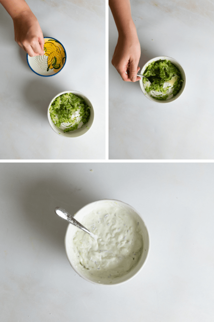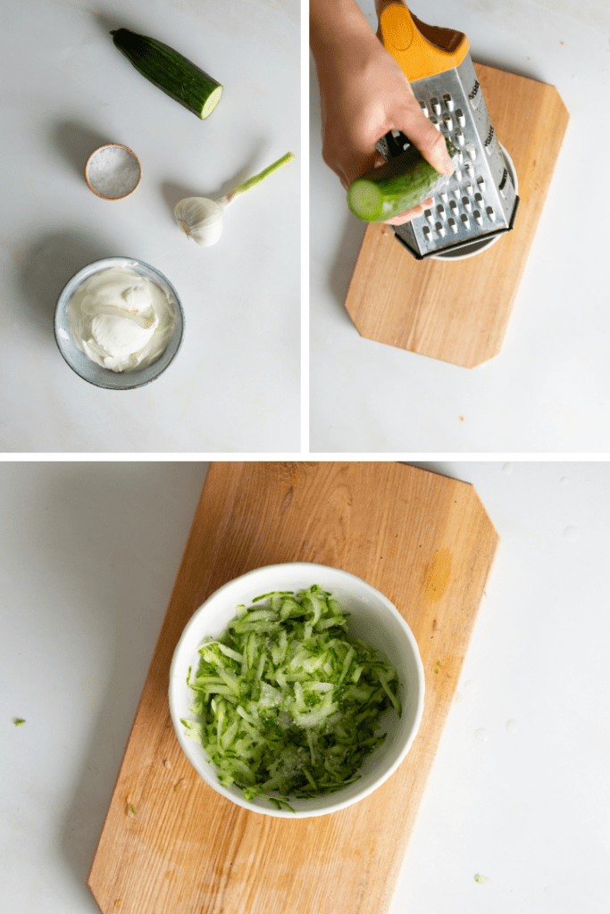 Gurke grob raspeln und mit etwas Salz vermengen. Ca. 10 Minuten stehen lassen, sodass überschüssiges Wasser aus der Gurke austreten kann. Gurkenraspel dann durch ein Sieb gießen und ausdrücken.