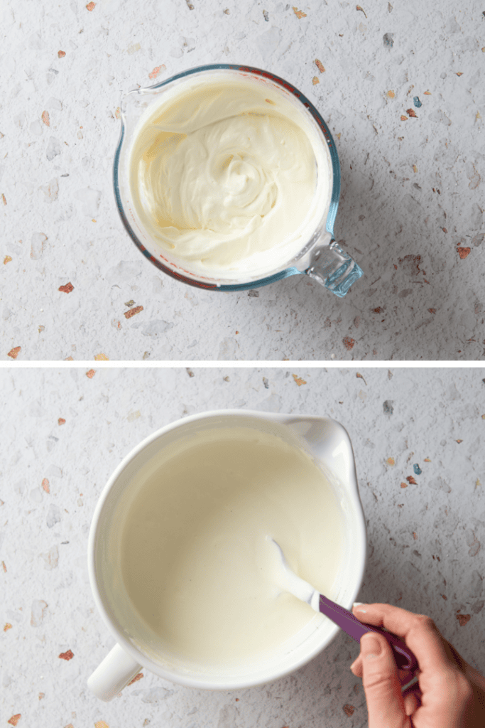 Schlage die Schlagsahne steif, rühre dann Joghurt und Mascarpone unter sowie Vanillezucker und Zucker.