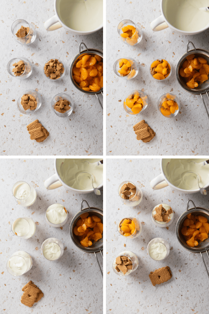 Lass die Mandarinen abtropfen und brich die Spekulatius in grobe Stücke.