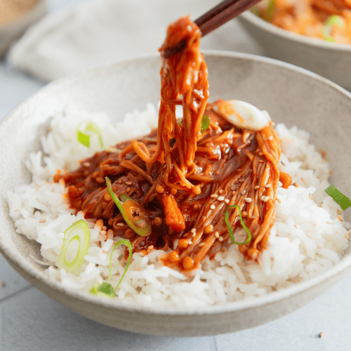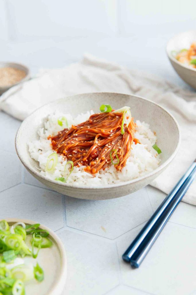 Serviere sie mit frisch gekochtem Reis, fein geschnittenen Frühlingszwiebeln sowie Sesam.