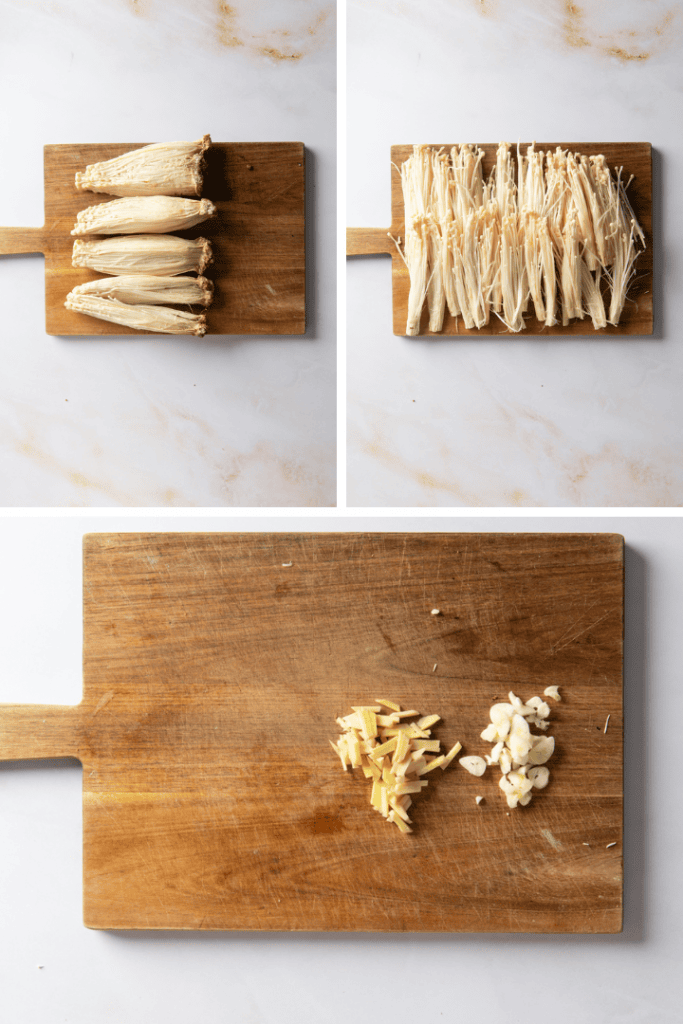 Befreie die Enoki Pilze vom Strunk und rupfe sie in mundgerechte Portionen. Hacke den Ingwer und den Knoblauch sehr fein.