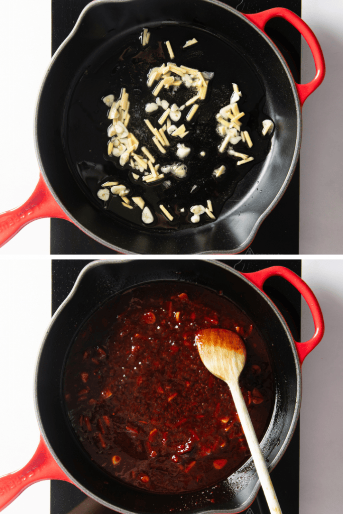 Erhitze das Sesamöl in der Pfanne. Brate Ingwer und Knoblauch darin an, bis sie glasig sind. Gib dann Gochujang, Sojasauce, braunen Zucker und Reisessig dazu und verrühre die Zutaten gründlich.