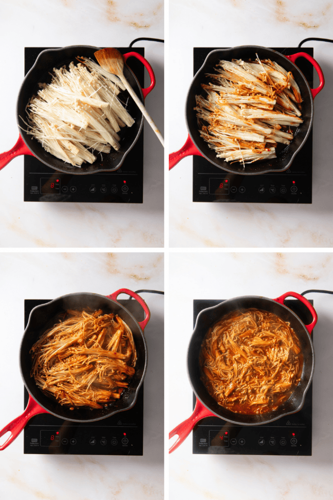 Gib dann die vorbereiteten Enoki Pilze in die Pfanne, rühre vorsichtig um und gare die Enoki Pilze bis sie zart sind.