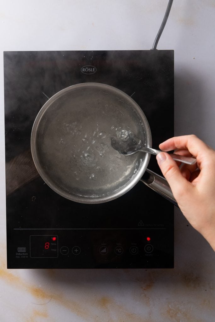 Wasser in einem Topf zum sieden bringen. Das Wasser darf nicht sprudelnd kochen, sondern sollte lediglich leicht köcheln bzw. sieden. Das Wasser mit ca. ½ TL Salz pro Liter würzen.