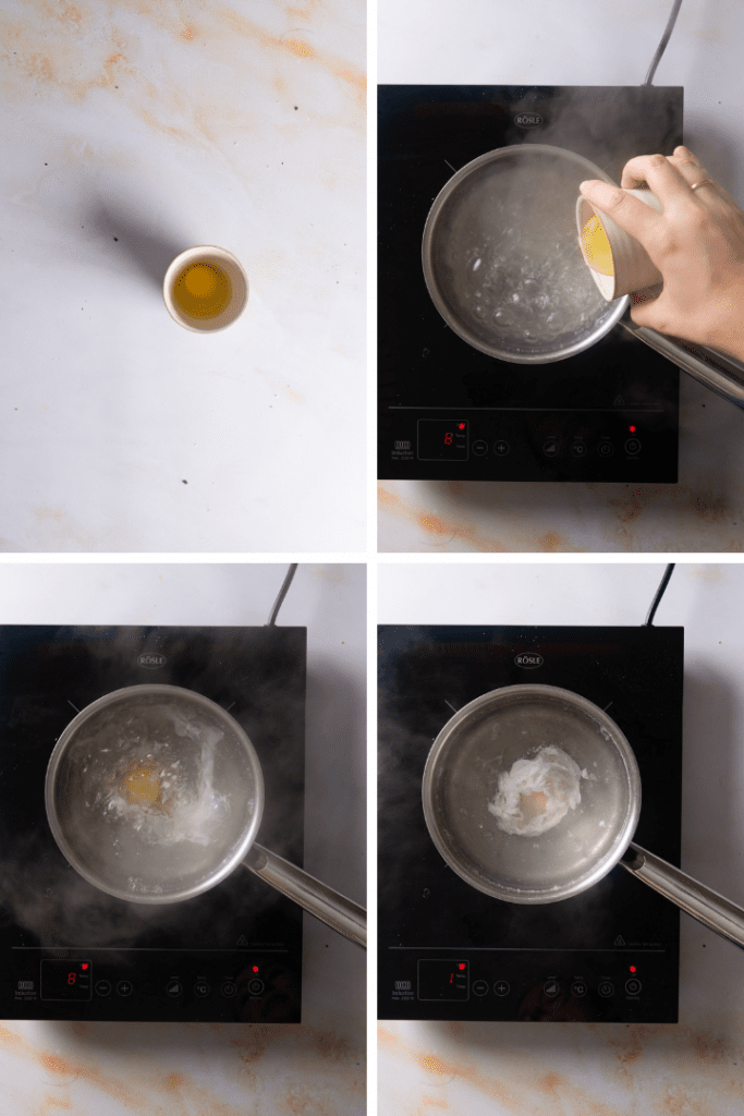 Ei vorsichtig in eine Tasse aufschlagen. Mit Hilfe eines Löffels das Wasser im Topf etwas umrühren, um einen kleinen Strudel in der Topfmitte zu erzeugen. Das Ei nun aus der Tasse vorsichtig in die Mitte dieses Strudels gleiten lassen.