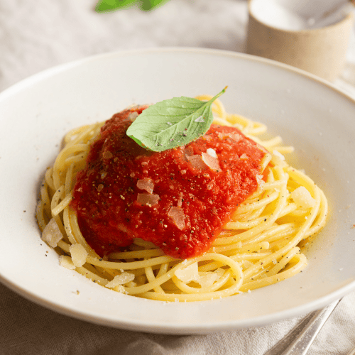 Gieße die Nudeln ab, sobald der Timer abgelaufen ist. Fange dabei 1 Tasse des Kochwassers auf. Du kannst damit später die Soße verdünnen, falls nötig. Serviere die Nudeln nun direkt. Mein Tipp: Wenn die Nudeln länger als 5 Minuten stehen, neigen vor allem lange Nudeln zum Kleben. Wenn es sich nicht vermeiden lässt, dass die Nudeln länger stehen, kannst du einen Schluck Olivenöl darüber geben und unterrühren, so kleben die Nudeln weniger.