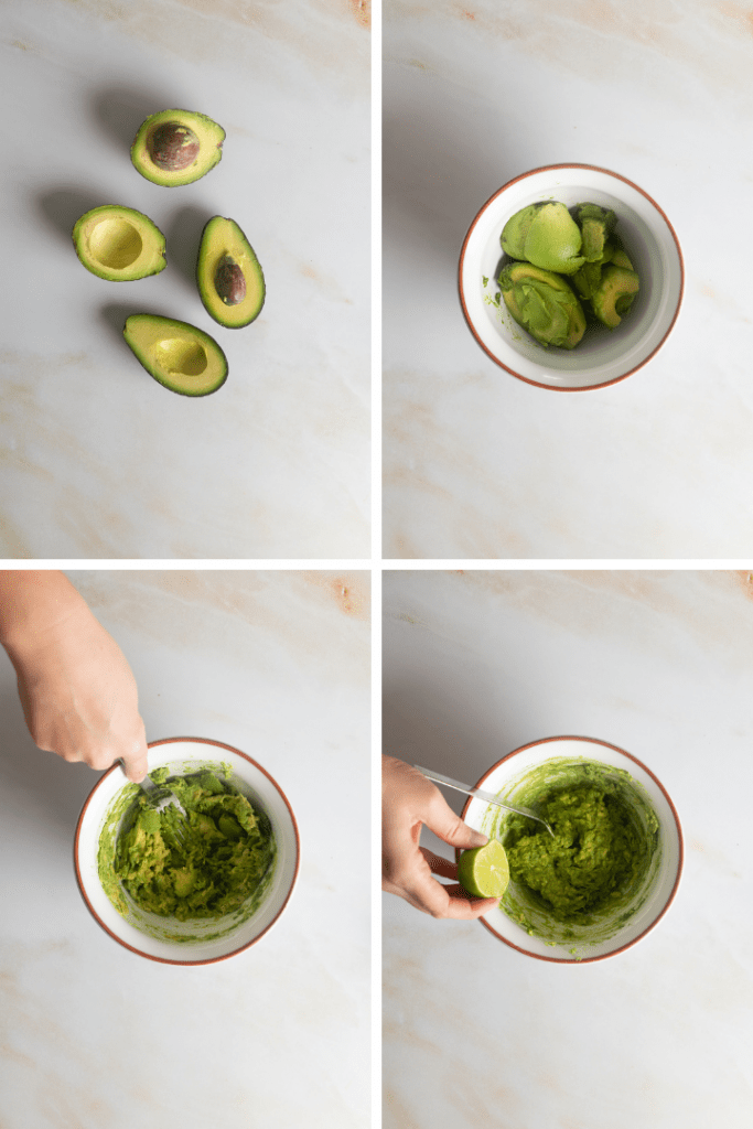 Avocados waagerecht halbieren, Avocado öffnen und den Kern entfernen. Nun das Fruchtfleisch mit einem Löffel aus der Schale lösen. Avocado-Fruchtfleisch in eine Schüssel geben und mit einer Gabel zerdrücken. Direkt die Limette dazu pressen, damit die Avocado nicht oxidiert und braun wird. Schmecke die Avocadobasis nun mit Salz ab. Die Guacamole kann so bereits serviert werden.