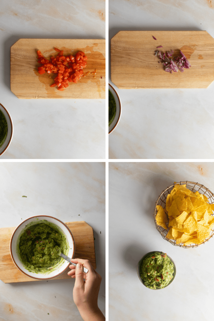 Nun die Tomate in kleine Würfel schneiden. Zwiebel sehr fein hacken. Den Knoblauch ebenfalls sehr fein hacken oder reiben. Zur Avocado geben. Dann Koriander und Chili fein hacken und ebenfalls dazugeben. Gut vermengen und die Guacamole mit Salz abschmecken. 5-10 Minuten ziehen lassen, erneut abschmecken und servieren. Mein Tipp: Wer es weniger scharf mag, sollte die Kerne und die helle Membran der Chilischote entfernen, bevor sie gehackt wird.