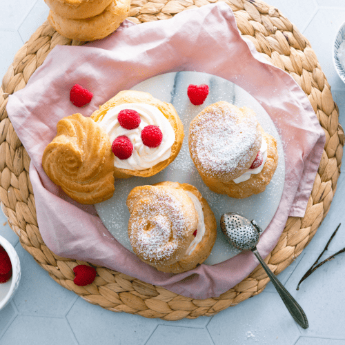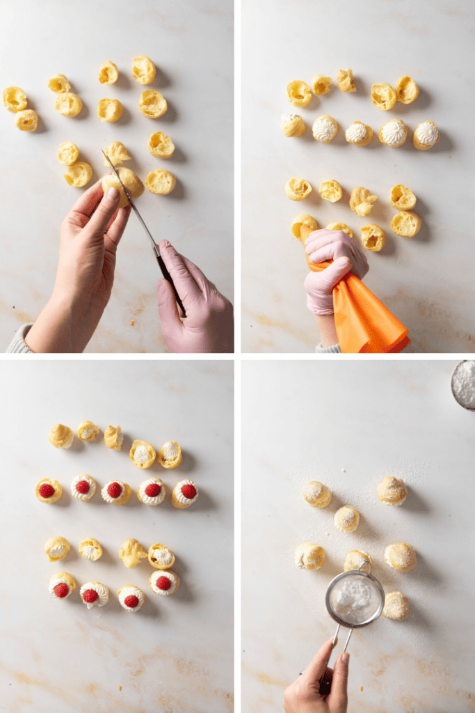 Halbiere die Windbeutel waagerecht und Spritze die Sahne als Tuff hinein. Lege die Himbeeren darauf und setze dann die zweite Hälfte des Windbeutels wieder darauf. Bestäube die Windbeutel mit etwas Puderzucker und stelle sie bis zum Servieren in den Kühlschrank.