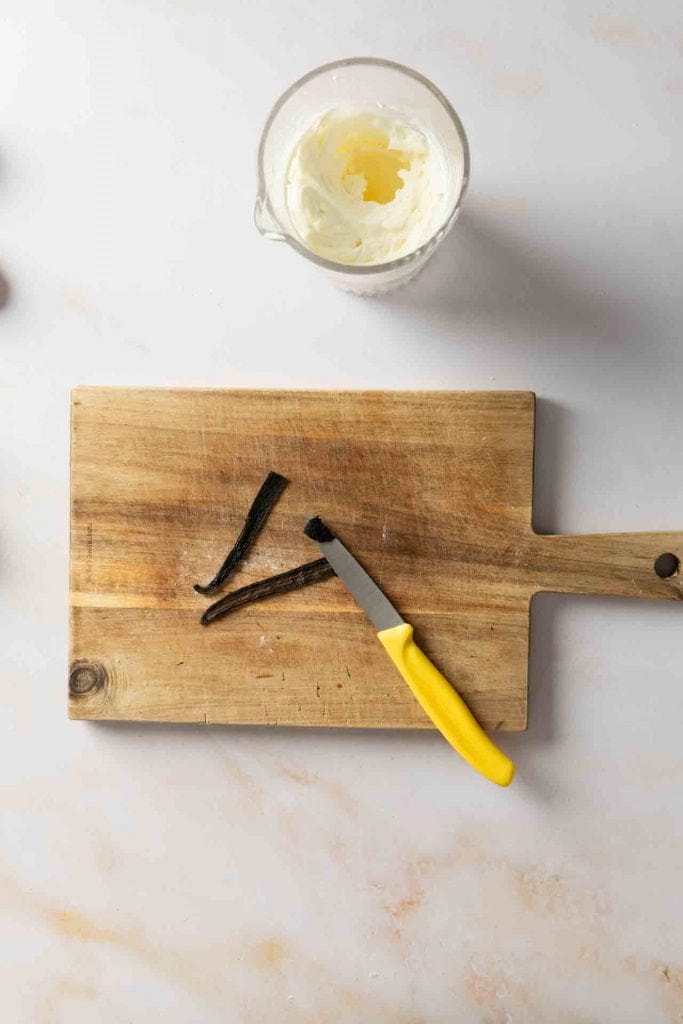 Schlage die Sahne steif und vermenge sie mit Puderzucker und dem Mark einer halben Vanilleschote. Fülle die Sahne in einen Spritzbeutel mit Sterntülle.
