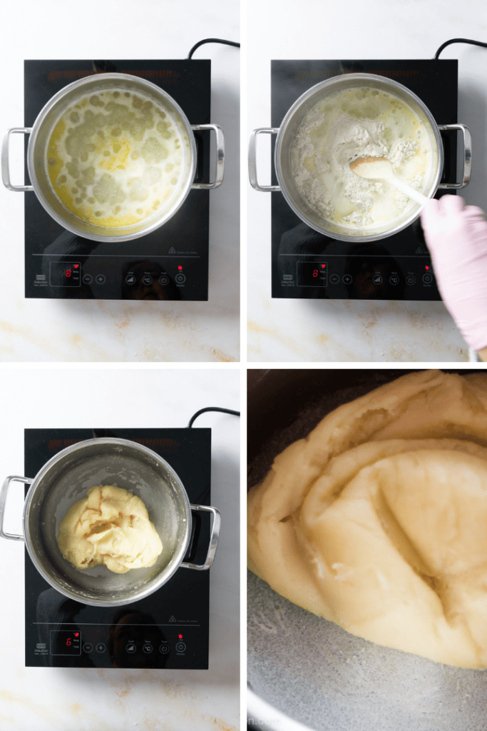 Heize den Backofen auf 180 °C Ober- und Unterhitze vor. Gib Wasser, Salz und Butter in einen Topf und bringe die Mischung zum Kochen. Kippe das Mehl auf einen Schlag in das kochende Wasser und rühre kräftig um. Lass den Topf dabei auf dem Herd stehen. Es entsteht nach kurzer Zeit ein Teigknödel, der sich vom Topf löst. Am Boden des Topfes bildet sich eine weiße Schicht.