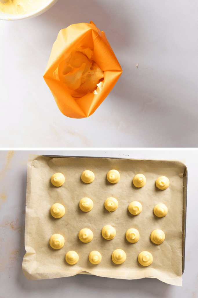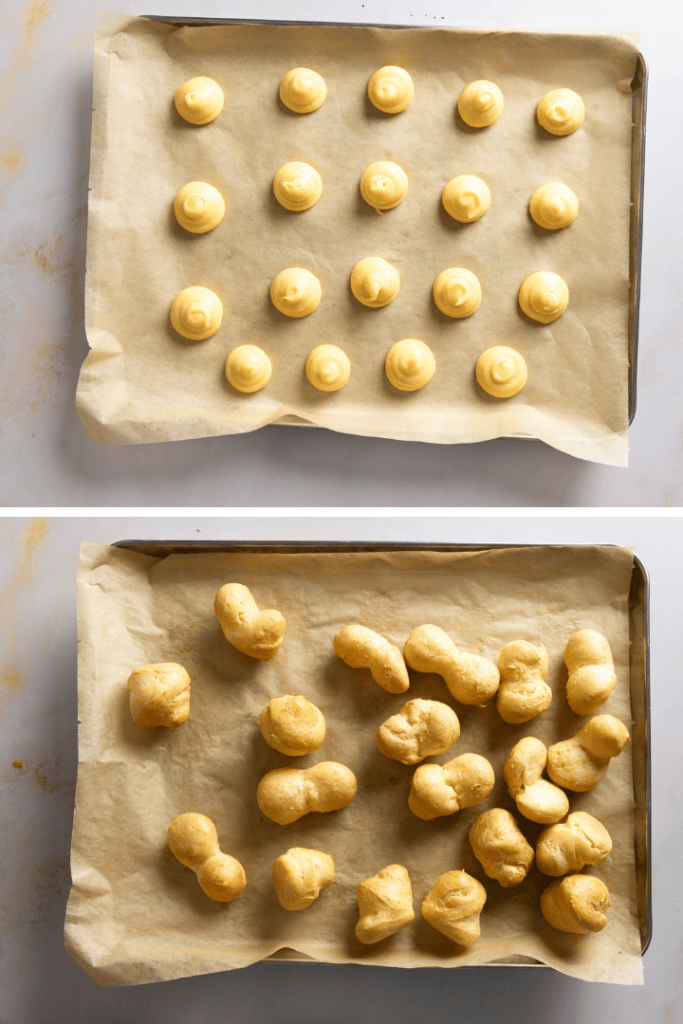 Fülle den fertigen Brandteig in einen Spritzbeutel mit Sterntülle und spritze den Teig in Tuffs auf ein Backblech mit Backpapier. Lass auf jeden Fall reichlich Platz zwischen den Teigportionen, denn Brandteig geht im Backofen sehr stark auf.