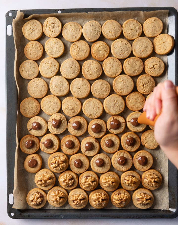 Backe die Walnusstaler im vorgeheizten Backofen etwa 12-15 Minuten bis sie an den Rändern goldbraun werden. Lass sie komplett abkühlen.