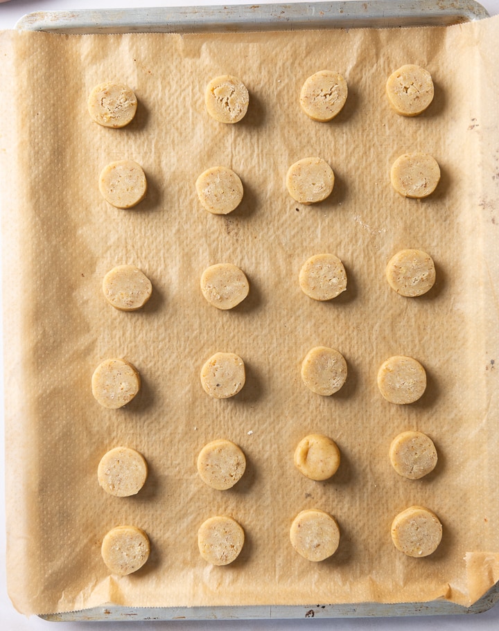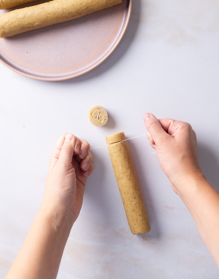 Schneide die Teigstränge in etwa 7 mm dicke Scheiben und lege sie mit etwas Abstand auf ein Backblech. Du kannst zum Schneiden ein Messer verwenden, besonders gleichmäßig werden die Walnusstaler jedoch, wenn du sie mit einem Stück Bindfaden schneidest, den du zu einer Schlinge formst.