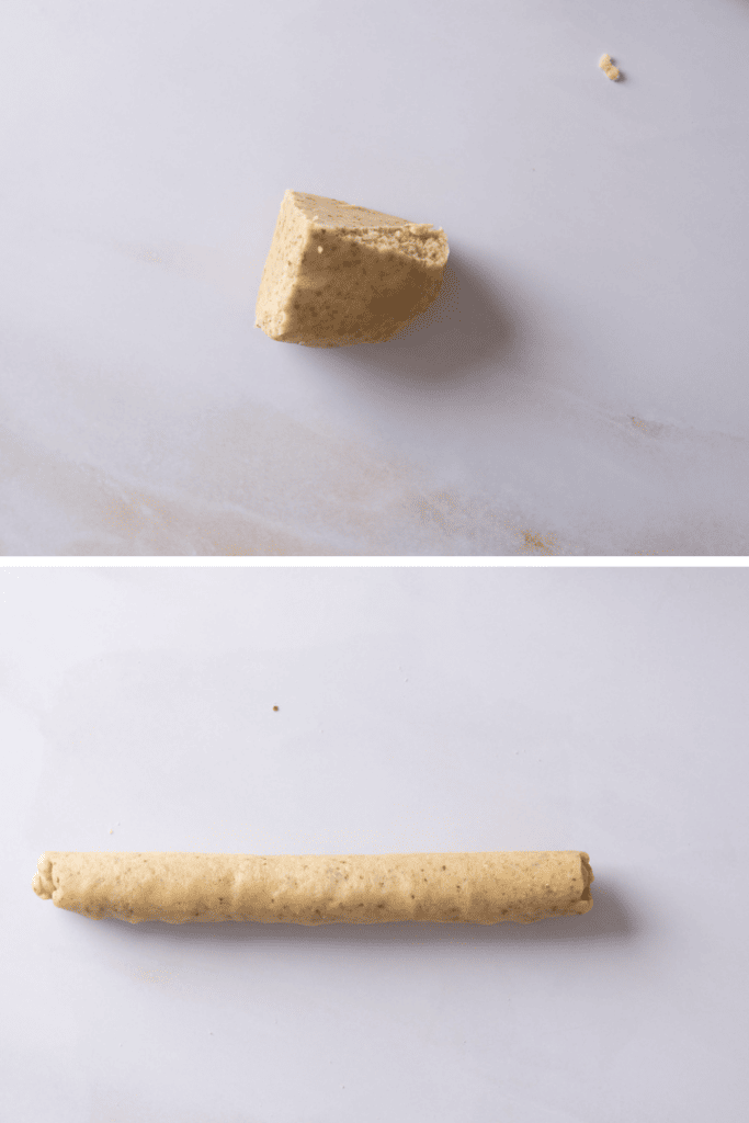 Heize den Backofen auf 170 °C Ober- und Unterhitze vor. Knete den Teig kurz geschmeidig und forme ihn zu Teigsträngen von etwa 3-4 cm Durchmesser. Kühle diese Teigstränge erneut etwa 1 Stunde im Kühlschrank.
