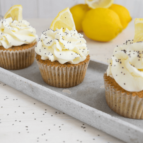 Die Creme in einen Spritzbeutel mit Sterntülle füllen und auf die Cupcakes spritzen. Mit Mohn und einem Zitronenstückchen dekorieren.
