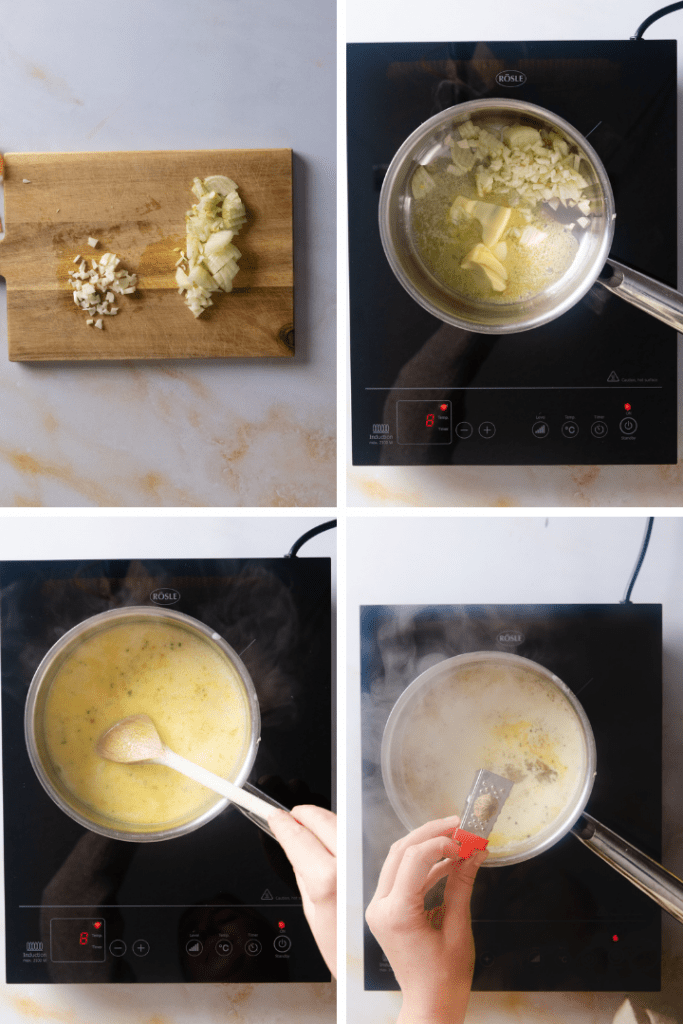 Backofen auf 170 °C Ober- und Unterhitze vorheizen. Zwiebel und Knoblauch fein hacken. In einem Topf, Butter erhitzen, Zwiebel und Knoblauch glasig dünsten, dann Milch, Schlagsahne und Gemüsebrühe dazugeben. Etwa 10-15 Minuten auf kleiner Flamme köcheln lassen.