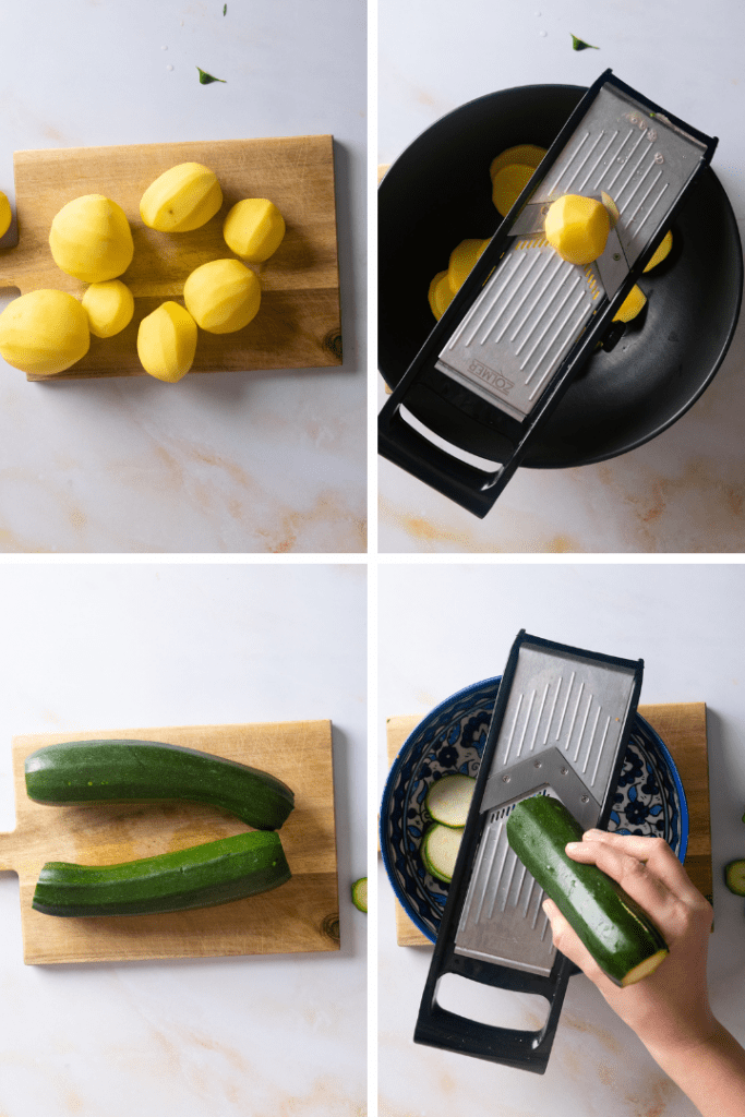 Derweil die Kartoffeln schälen und in etwa 3-4 mm dicke Scheiben hobeln. Zucchini waschen und ebenfalls in 3-4 mm dicke Scheiben hobeln. Wer keinen Küchenhobel hat kann Kartoffeln und Zucchini natürlich auch mit der Hand schneiden.